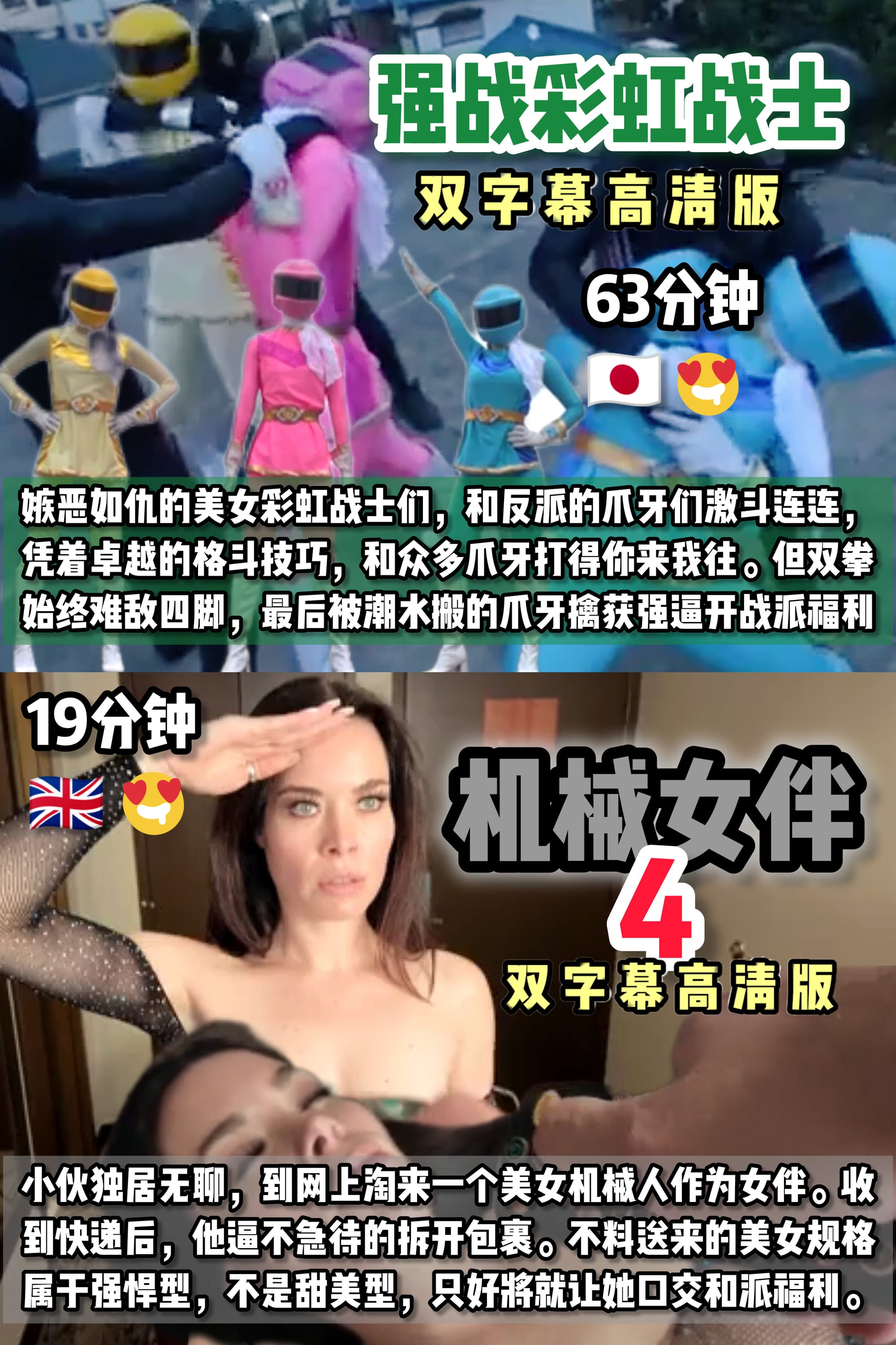 美女和闺蜜是城里有名成人玩具厂里的质检员,为了真正快 速的测试产品并汇报各种珍贵的数据,给厂里的人工智能模 型参考,她们被改造成半机械人,闲时还会两女作战派福利 (36分钟)