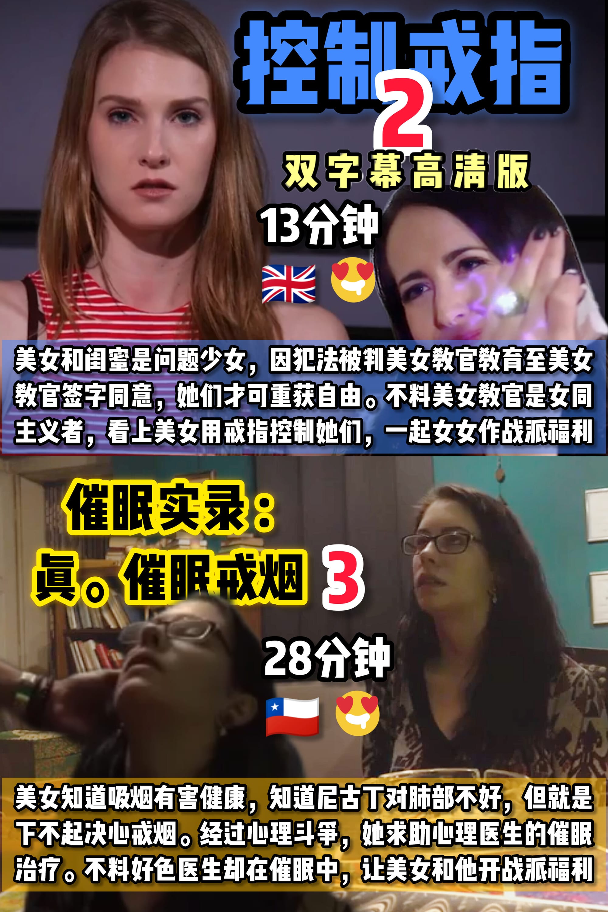 美女是位女同,也身为催眠师,得知女儿偷偷吸她的香烟后 决定使用催眠治疗纠正她,女儿却不以为然,经过劝说才同 意。美女成功催眠女儿后,在女儿不会反抗下女女派福利。 (17分钟)