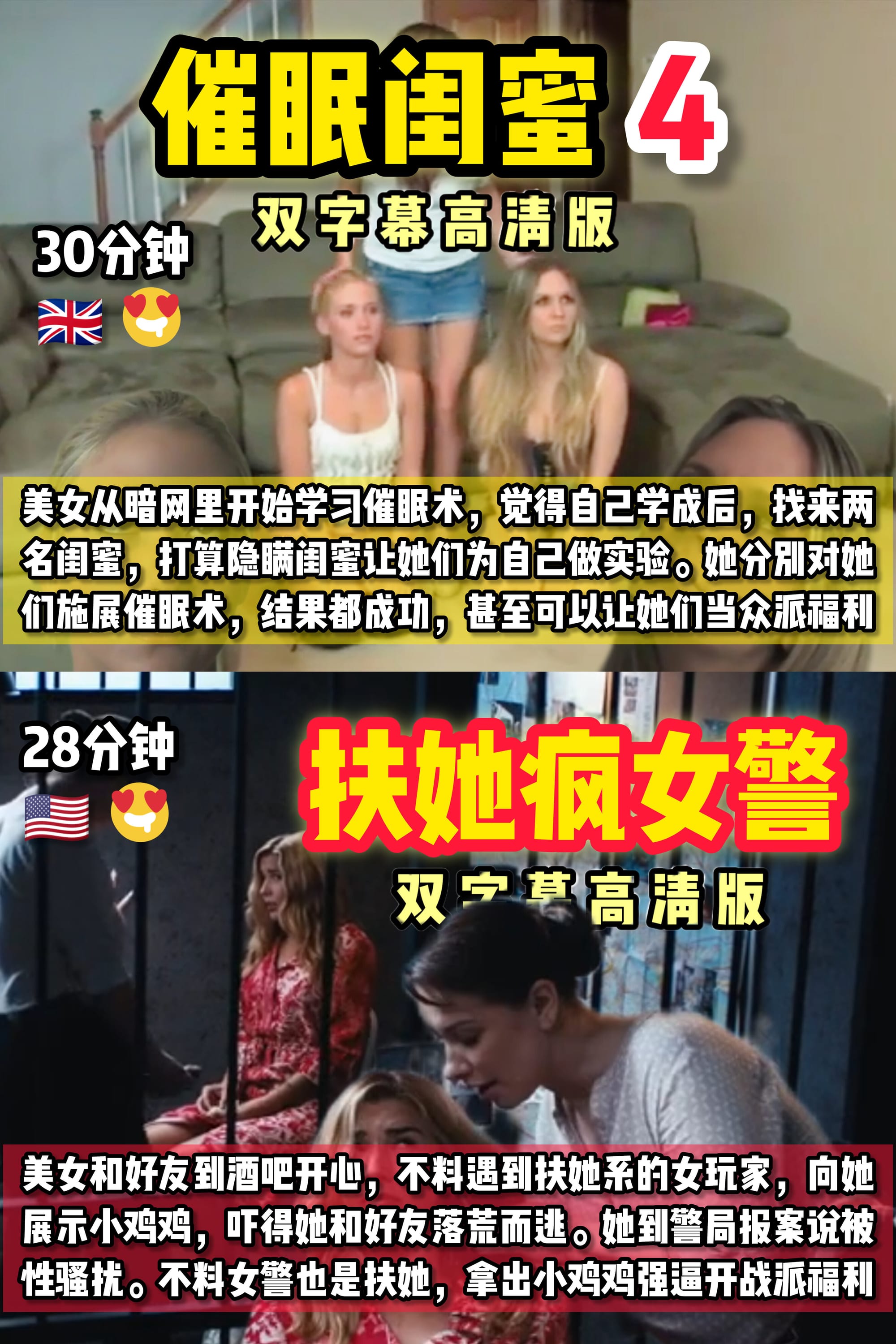 美女和闺蜜的感情非常好,打 从认识开始,她就对闺蜜处处 照顾周到。其实美女本身是女 同,所以把感情看得十分重的 代入男方角色,向闺蜜表白后 闺蜜坚决不同意。美女一气之 下把闺蜜体毛和巫毒娃娃一起 下咒,果然闺蜜不受控的和她 一起女女开战派福利了。(15分钟)